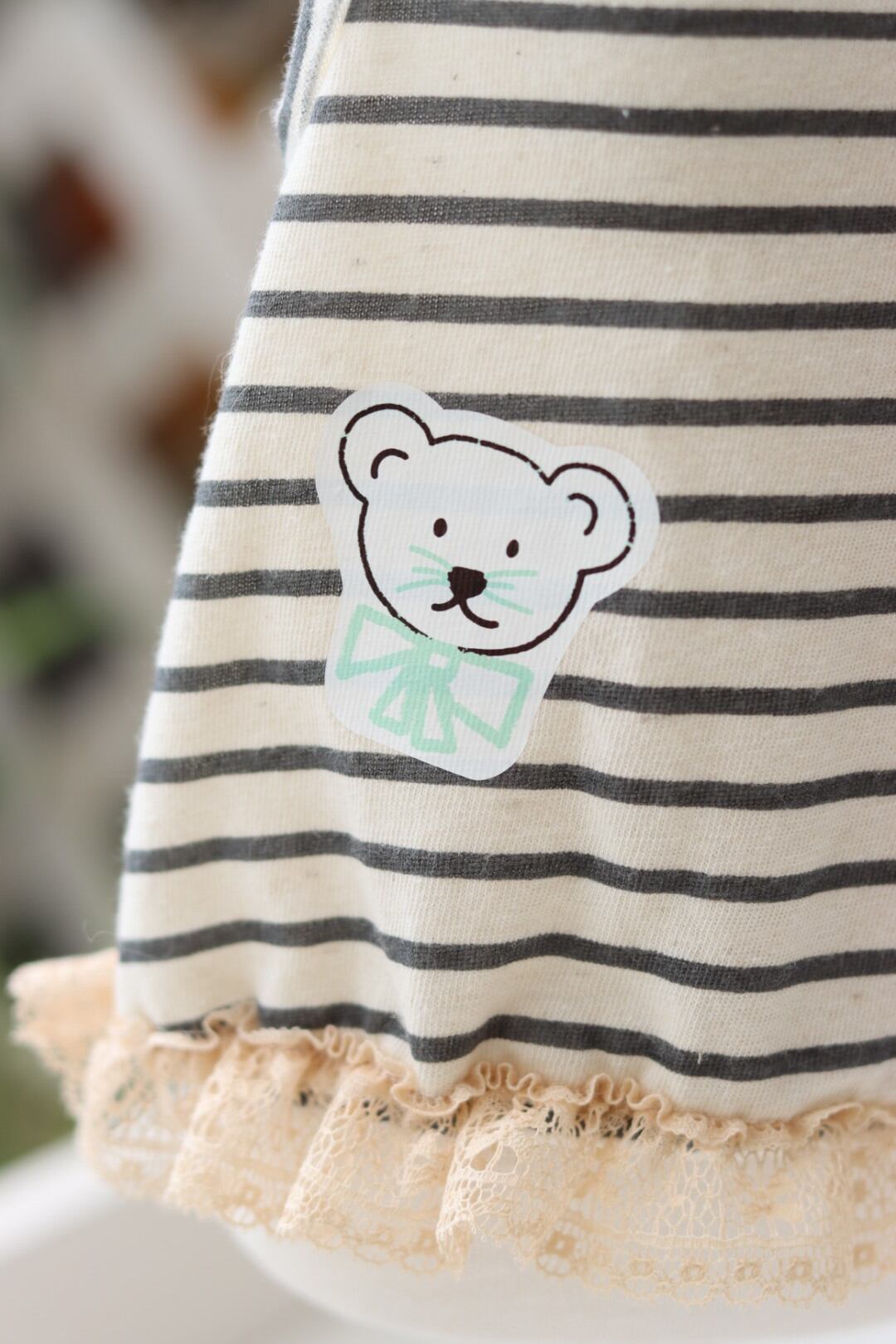 グレーの優しいボーダーにくまちゃんのプリント、裾にはシンプルなフリルが可愛いデザインです。